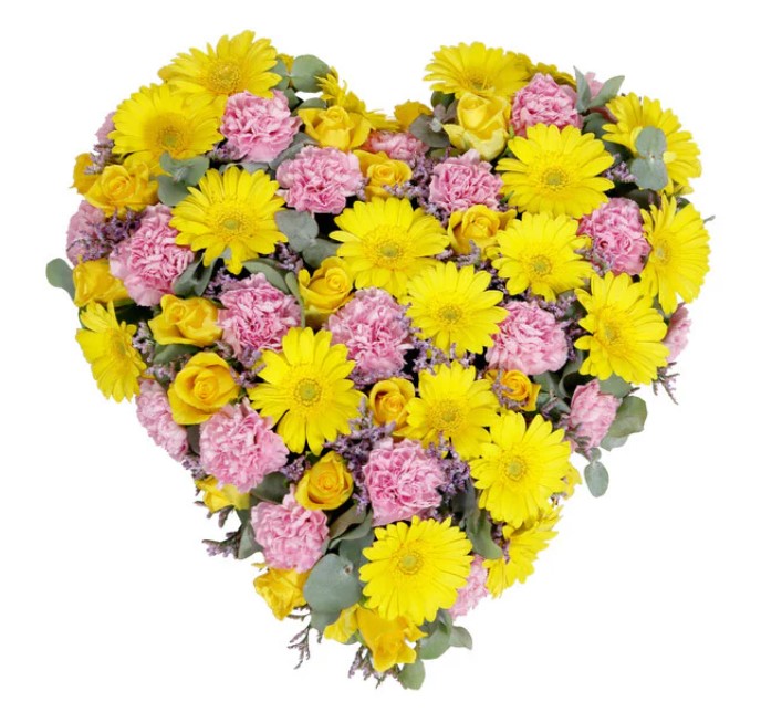 Superbe coeur de fleurs de saison pour une éternelle déclaration d’amour -Taille L : 80 /85 cm - Ruban inclus avec 50 caractères max - Tonalité au choix : Blanc/Vert ou Blanc/Parme ou Rose/Fuchsia ou Pastel ou Coloré -