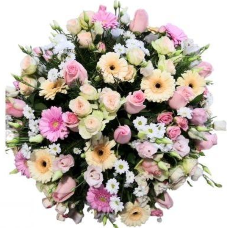 Elégante gerbe piquée mousse à base de fleurs précieuses et de saison -Taille M : 70 / 75 cm - Ruban inclus avec 50 caractères max - Tonalité au choix : Blanc/Vert ou Blanc/Parme ou Rose/Fuchsia ou Pastel ou Coloré -