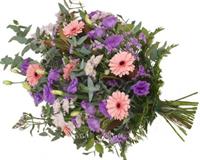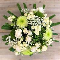 Elégante gerbe piquée mousse de style graphique à base de fleurs précieuses et de saison - Taille S : 60 / 65 cm - Ruban inclus avec 50 caractères max - Tonalité au choix : Blanc/Vert ou Blanc/Parme ou Rose/Fuchsia ou Pastel ou Coloré -