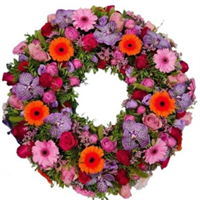 Elégante couronne de fleurs de saison avec feuillage pour un dernier hommage - Taille L : 100 / 120 cm - Ruban inclus avec 50 caractères max - Tonalité au choix : Blanc/Vert ou Blanc/Parme ou Rose/Fuchsia ou Pastel ou Coloré -
