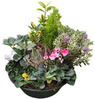 Jardin de plantes de saison en terre : 3 à 4 plantes vertes et fleuries en Corbeille Osier - Taille S : diamètre env. 40 cm - Tonalité au choix : Blanc ou Rose ou Coloré - Convient pour les cimetières, longue durée -