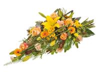 Photo non contractuelle | Raquette de fleurs / Dessus de Cercueil - Taille L Raquette de fleurs de saison agrémentée d'un généreux feuillage, de forme allongée pour un dessus de cercueil -