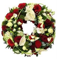 Elégante couronne de fleurs de saison avec feuillage pour un dernier hommage - Taille L : 100 / 120 cm - Ruban inclus avec 50 caractères max - Tonalité au choix : Blanc/Vert ou Blanc/Parme ou Rose/Fuchsia ou Pastel ou Coloré -
